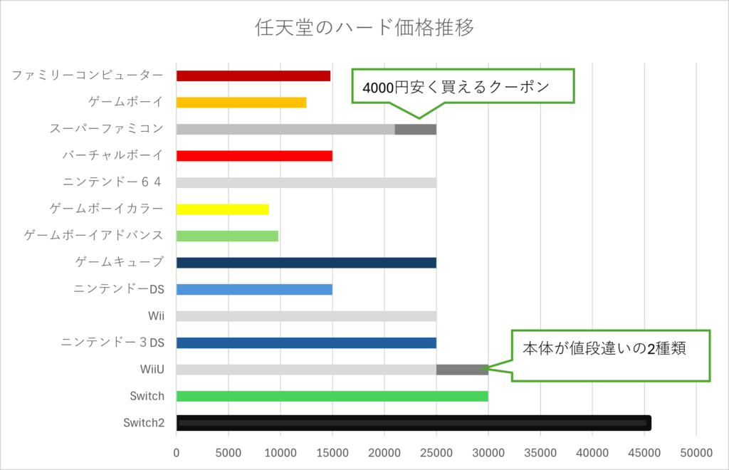 ↑Switch2の価格は税込み49980円ですがグラフ上は他ハードと同じく税抜表記です。発売時点の価格が基準で3DS等の値下げした価格は考慮していません。